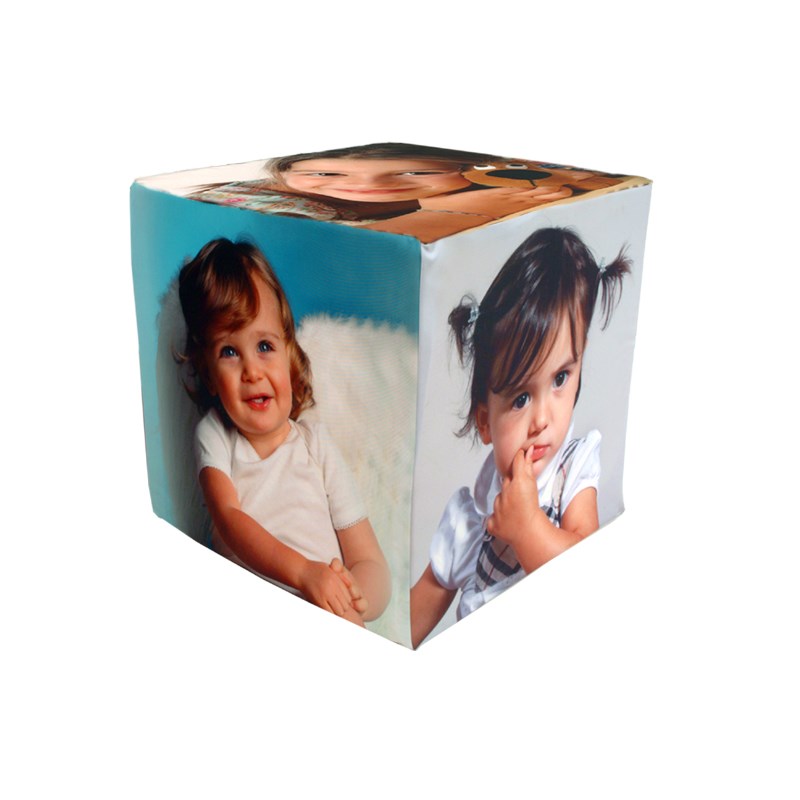 Cubo personalizzato in spugna rigida realizzato in vari colori e predisposto per 6 immagini una per ogni lato, è ideale per rendere elegante e raffinato qualunque ambiente in casa o in ufficio. La parte superiore della seduta è in raso o vellutato di un colore a scelta mentre il lato sotto è di materiale resistente di colore nero. E' possibile anche sederci sopra utilizzandolo come puff per bambini.